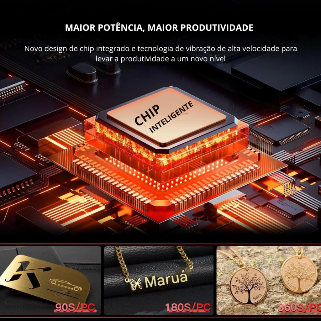 Além disso, esta máquina inclui um eixo rotativo, permitindo gravar em superfícies cilíndricas, como copos, garrafas, canetas, anéis, alianças, braceletes, entre outros itens, expandindo ainda mais as possibilidades de personalização.